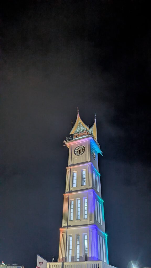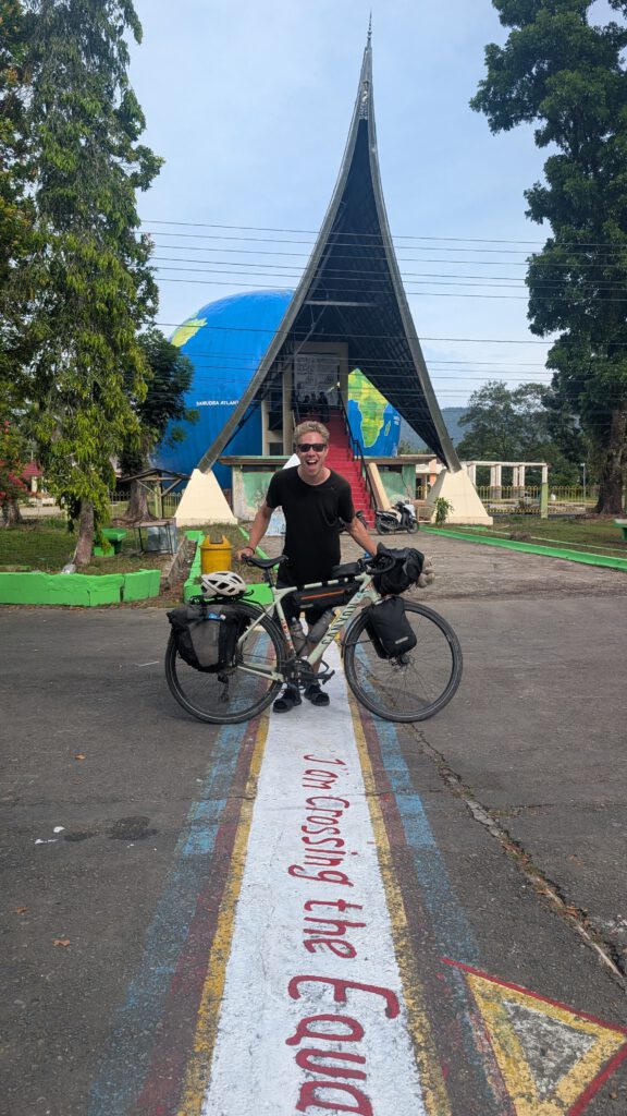 Onderweg naar de volgende stad Bukittinggi ga ik voor het eerst deze reis de evenaar over. Al ruim meer dan een jaar onderweg en ik ben eigenlijk alleen nog maar in de bovenste helft geweest van de wereld. Nu is er op het noordelijk halfrond ook wel meer landmassa, maar het is alsnog gek om te beseffen. Langs de weg staat een hele grote wereldbol om de evenaar te markeren en er is op de weg een streep gemarkeerd. Er is in de omgeving verder helemaal niks, dus er zijn ook helemaal geen andere toeristen. Ik ben de enige die er wat foto’s maakt. Er komt een schoolbus met kinderen aan die op schoolreisje zijn. De kinderen willen allemaal liever met mij op de foto dan met de lijn van de evenaar.