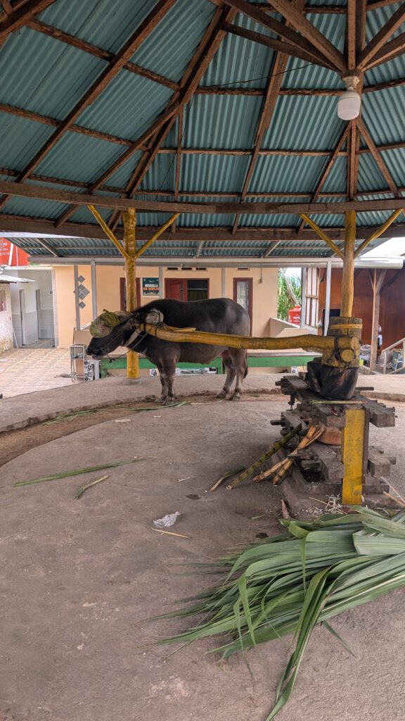 Vanuit Bukittinggi doe ik ook een dagtocht naar het meer Maninjau. Bij het meer was het hartstikke mistig en dat was daarom ook niet zo bijzonder om te zien. Onderweg naar het meer kwam ik langs een boerderij waar ze op traditionele manier suikerrietsap maken. Er loopt een buffel rondjes; hierdoor gaat er in het midden een grote pers draaien. In de pers wordt het sap uit het suikerriet geperst. Ik heb in andere landen ook wel eens suikerriet geproefd. Ik weet niet of deze suikerriet een andere soort is, maar ik vind deze echt een stuk lekkerder. Het is een lokale familie die een klein winkeltje runt met naast het suikerrietsap ook allerlei verschillende noten. De familie neemt rustig de tijd om mij veel te vertellen over de traditie van suikerrietsap. Ik kocht er nog wat nootjes en ging weer verder op avontuur.