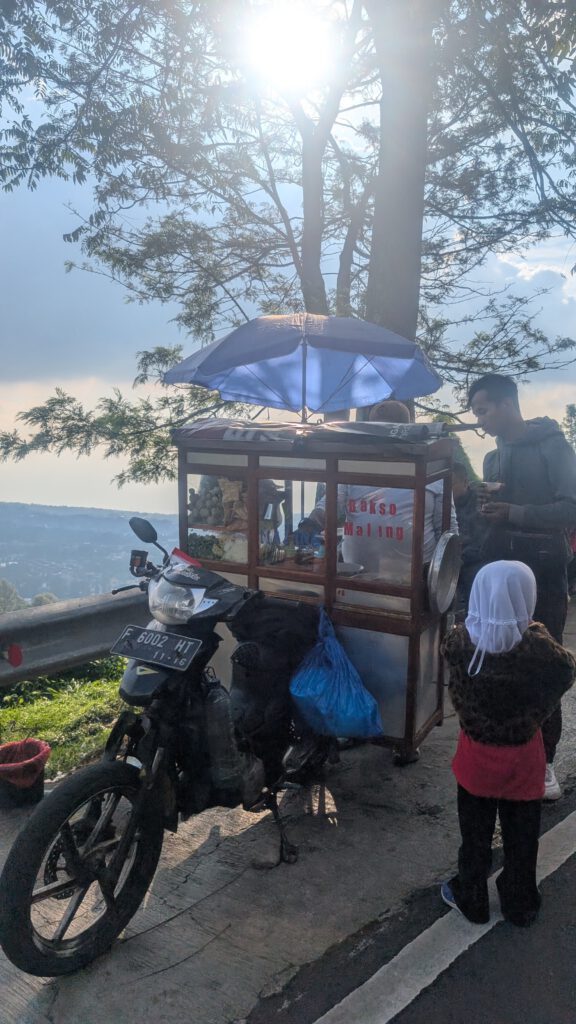 Vanuit Jakarta fiets ik in twee dagen naar de stad Bandung. Ik fiets over de Puncak Pass. Dit is een bergpas die de twee grote steden met elkaar verbindt. Ik had gedacht dat het op de bergpas wat rustiger zou zijn met mensen en verkeer. Dit had ik echt helemaal mis, het voelt hier nog steeds als één grote aan elkaar gegroeide stad. De toeters vliegen mij om de oren en ik verlang weer naar de rust en vriendelijkheid van Sumatra. Na de Puncak Pass vraag ik bij een groot restaurant of ik mijn tent op mag zetten. Ik ben best verbaasd dat dit meteen mag. De eigenaar vindt het niet helemaal veilig dat ik mijn tent er zomaar buiten op zet. In plaats daarvan mag ik in de gebedsruimte slapen die op slot kan. Ook mag ik mijn fiets er veilig binnen zetten. Het eten in het restaurant is echt heerlijk en dat geldt trouwens überhaupt voor al het eten hier in West-Java. De eetmomenten zijn toch wel momenten waar ik telkens naar uitkijk als ik over de stoffige wegen fiets met toeterende auto’s en scooters om mij heen.