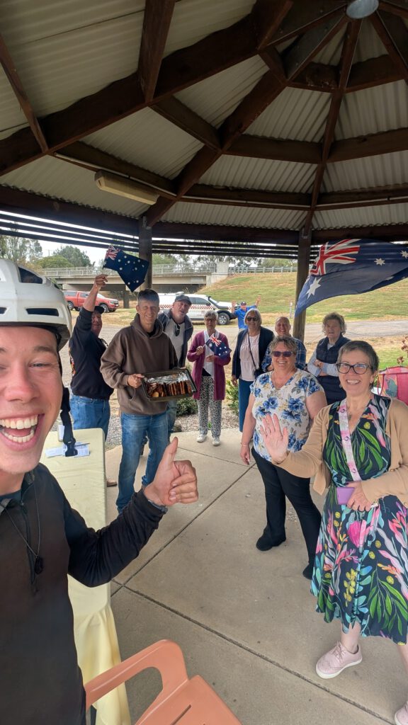 De volgende ochtend lig ik in mijn tent — ik ben net wakker — en ik hoor redelijk dicht bij mijn tent een man in het Engels zeggen: “Hey mannen, wie is er op de fiets gekomen vanmorgen?” Ik kon mijn lach moeilijk inhouden, omdat het duidelijk was dat hij het over mijn fiets had; hier in Australië wordt er bijna niet gefietst. Ik begin met mijn spullen op te ruimen en maak een praatje met een van de mannen. Het is vandaag Australia Day, een nationale feestdag. Ze gaan precies hier waar ik met mijn tent sta, ontbijten met een aantal mensen uit het dorp. Ze vinden het prachtig dat ik hier afgelopen nacht heb gekampeerd en ik ben uitgenodigd om mee te ontbijten. Er worden worstjes en eieren gebakken en dit wordt gegeten op een broodje met veel ketchup erbij. Heerlijk, zo’n lokale ervaring, en na een stevig ontbijt kan ik er weer tegenaan.