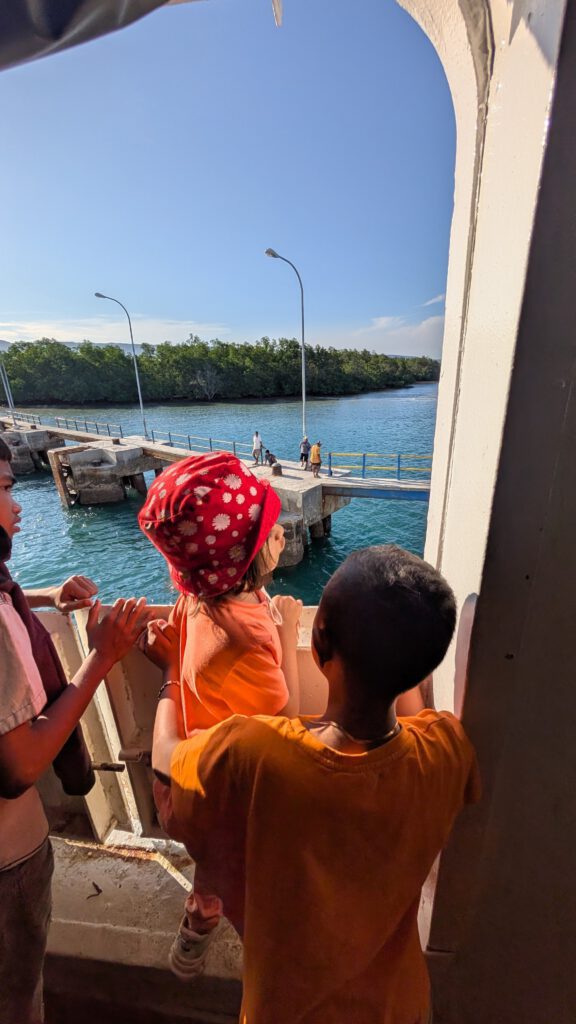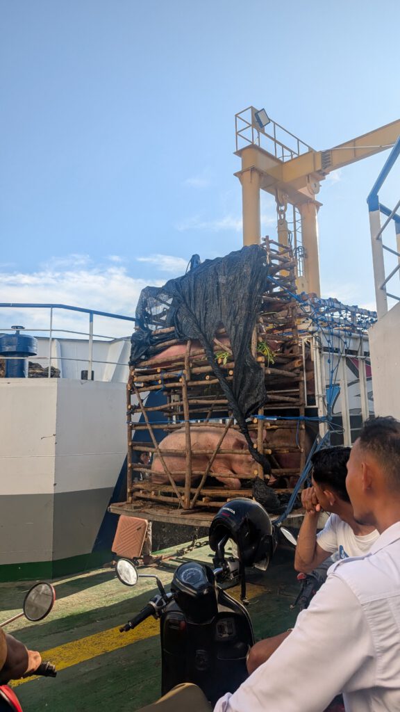 Vanaf Aimere ga ik met de ferry naar het eiland Sumba. Ik zal hier een rondje over het eiland fietsen wat een week duurt. Het is een mooi moment om te beschrijven hoe het er op zo’n ferry in Indonesië aan toe gaat. De voorbereiding met het vinden van de datums en tijden is al een avontuur op zich, maar daar heb ik eerder al over geschreven. Wanneer je dan de datum en tijd hebt en je gaat naar de haven, moet je eerst nog uitzoeken waar je een ticket kan kopen. In Aimere heb ik de ticketverkoop gevonden, maar die blijft nog heel lang dicht. Ondertussen is de ferry al aangekomen en komt iedereen al van boord af. Ik wil nu wel een kaartje kunnen kopen, want anders ben ik straks te laat. Wanneer de verkoop opengaat, stormt iedereen op het loket af. Ik vind dit echt helemaal niet prettig om tussen te staan, dus besluit ik om eerst een kopje thee te drinken bij wat locals. Ze stellen mij gerust dat de verkoop nog open blijft en dat de ferry nog niet weggaat. Eenmaal bij de verkoop geef ik mijn paspoort en zeg ik dat ik met de fiets ben. Vervolgens komen er allemaal andere mensen tussendoor die ook een kaartje willen kopen en die ineens voor mij gaan staan. Ik word er heel naar van, maar voor de locals is dit de normaalste zaak van de wereld. Er zit blijkbaar een systeem in waarbij veel mensen eerst hun identiteitskaart afgeven en daarna betalen als ze het ticket krijgen.