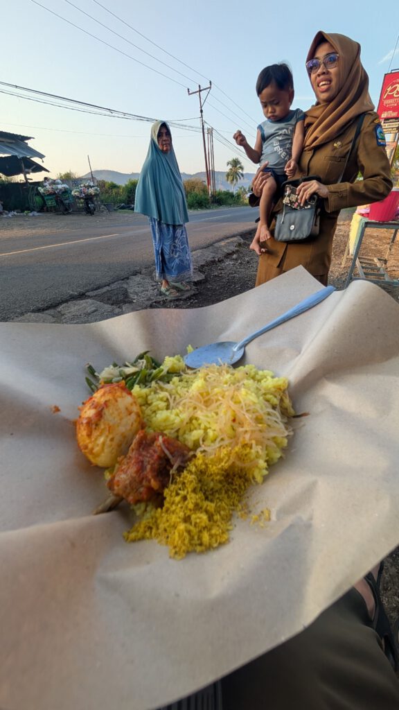 In het gezin help ik met koken, speel ik met het jongste kind en is er ook veel tijd om te praten met elkaar. ’s Ochtends verkopen ze aan de weg ontbijt. Het ontbijt wat veel mensen hier in Indonesië eten is wel heel anders dan wat we in Nederland eten. De mensen eten hier vaak drie keer per dag rijst, dus ook als ontbijt. Het gerecht wat ze aan de weg verkopen is nasi kuning, gele rijst. Het is rijst met gebakken tempeh, een ei, wat noodle en een stukje gebakken kip, ik vind het heerlijk en zou dit iedere dag wel als ontbijt kunnen eten.