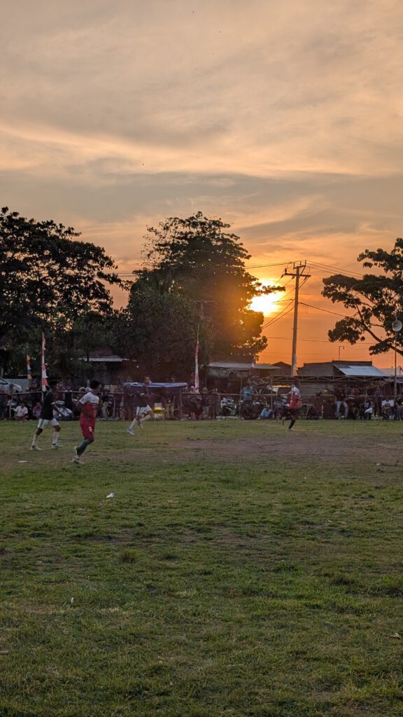 De eerste dag dat ik er ben laat ’s ochtends opa met volle trots zijn tuin zien. Ik vind tuinen altijd leuk om te zien omdat ik zelf vroeger ook in een moestuin heb gewerkt. Hij heeft koeien, kippen, wat groenten, fruitbomen en olifantengras als voer voor de koeien. Ik vind het prachtig om te zien en opa vindt het prachtig om te laten zien, win-win. Die middag ga ik met wat vrienden van daar voetballen en kijken we ook bij een voetbalwedstrijd. Langs het veld zet iedereen zijn of haar scooter neer en daar ga je dan opzitten om te kijken. Als het druk wordt, staan de mensen vooraan, daarachter heb je een rij met mensen die op hun scooter zitten en daarachter een rij met mensen die op hun scooter staan.