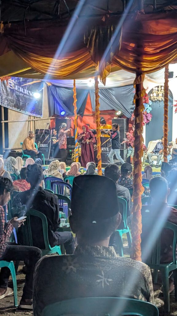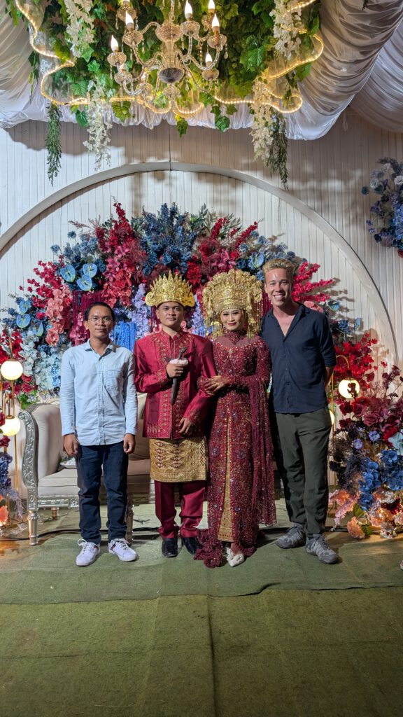 Savonds wanneer ik op zoek ben voor een slaapplek besluit ik het bij een restaurantje aan het water vragen. Terwijl ik het aan het vragen ben staan er allemaal locals om mij heen die aandacht willen, de situatie is vrij chaotisch. Ik heb met een van de medewerkers van het restaurant contact via google translate. Er wordt iemand gebeld van een homestay. Ik probeer uit te leggen dat ik helemaal geen homestay wil maar gewoon mijn tentje op wilt zetten. Ondertussen is de situatie zo chaotisch dat ik niet weet of ik hier nog wel wil slapen. Er weten nu zo veel mensen dat ik hier ben dat het niet snel rustig zal worden. Na een paar minuutjes komt er een jongen aan van een homestay. Hij spreekt perfect Engels en vraagt of ik opzoek ben naar een slaapplek. Dat is inderdaad het geval maar ik vertel hem ook meteen dat ik niet opzoek ben naar een slaapplek waar ik voor moet betalen omdat ik mijn eigen tent mee heb. Hij verteld dat hij zelf ook erg enthausiast is over fietsen en dat hij vaker andere fietsers bij hem thuis heeft laten slapen. Normaal hanteer ik altijd de regel dat als mensen naar jou toekomen met hulp dat je altijd extra voorzichtig moet zijn met de hulp aannemen. Deze jongen laat echter al snel filmpjes zien van hem met andere wereldreizigers op de fiets die bij hem thuis hebben geslapen, daardoor heb ik er een goed gevoel bij en besluit ik om het te doen. Het ontvangst bij hem thuis is ook super fijn met een hele lieve moeder. Onverwachts vraagt hij ineens “Heb je zin om vanavond naar een bruiloft te gaan?” Ja natuurlijk heb ik daar zin in! Dat zijn de lokale ervaringen waarvoor ik reis. Ik douche even snel en daarna gaan we op de scooter naar de bruiloft. Ik heb echt geen idee hoe een bruiloft hier eruit ziet en hoe het eraan toegaat dus ik ga er heel open in. In iedere provicie van Indonesië worden bruiloften op een andere manier gevierd. In iedere provincie hebben ze andere kleding die ze aan doen en andere rituelen, soms duurt een bruiloft één dag, soms duurt een bruiloft één week. De bruiloft waar wij naar onderweg zijn duurt drie dagen en deze dag komen er heel veel vrienden en bekenden langs. Al in de verte horen we de muziek van de bruiloft. Dat is uberhaupt een ding in Indonesië, muziek staat altijd kei en kei hard. Bij binnenkomst worden we ontvangen door de familie en geven we een cadeau voor het liefdeskoppel. De avond is eigenlijk heel simpel: er komen heel veel mensen langs en er is karaoke. Iedereen die langs komt mag in de zaal gaan zitten en krijgt een kleine snack en wat water. Iedereen die langs komt moet een liedje zingen en moet ook op de foto met het bruidspaar. Wij gaan eerst op de foto met het bruidspaar en dat vinden ze echt fantastisch. Als er hier een blank persoon op je bruiloft komt dan werkt dat statusverhogend. Met mij werden er dan ook mega mega veel foto’s gemaakt. Vervolgens moesten we een liedje zingen. Maar als er karaoke gezongen wordt zingt er niemand mee en is er niemand enthousiast, dit is bij iedereen die een liedje zingt. Het voelt heel ongemakkelijk. De muziek staat zo hard dat je bijna geen gesprek kan voeren. Ik vind het heel gaaf om te zien maar na een uur vind ik het ook wel mooi geweest, ik wil mijn oren nog graag goed houden.