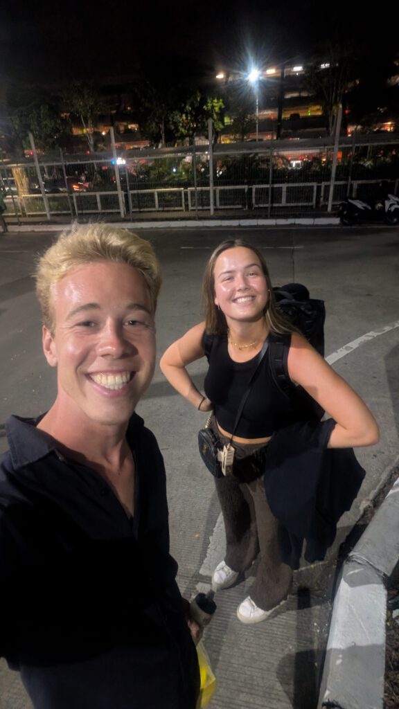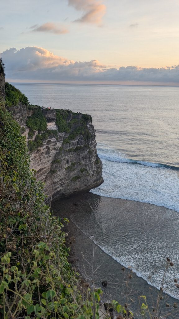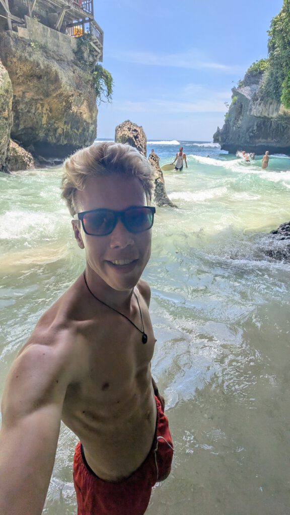 ’s Avonds komt Mees aan en ik regel dat we met de taxi vanaf het vliegveld naar ons verblijf worden gebracht. Ze komt ’s avonds laat aan, dus ik regel ook van tevoren dat we wat eten hebben voor bij terugkomst. Het is leuk om weer een vriendin van thuis te zien. De volgende dag banen we ons een weg tussen alle toeristen door in Uluwatu. Het is een schiereiland van Bali met best wel mooie stranden en kliffen. Ik ben gewend om altijd bij lokale tentjes te eten, maar het is hier zo onwijs toeristisch dat je die eigenlijk niet hebt. En als er dan wel een restaurant is wat Indonesisch eten serveert, is het drie à vier keer zo duur als dat ik normaal betaal. Best wel een contrast met Mees, want voor haar is het eten hier als je het vergelijkt met Nederland alsnog echt onwijs goedkoop. Grappig hoe ik dan zo gewend ben aan extreem goedkoop uit eten. In Uluwatu kan je ook goed surfen, maar het zijn wel golven voor gevorderden en dat zijn wij absoluut niet. Vanaf de kliffen kan je wel heel mooi kijken naar mensen die aan het surfen zijn. Dat doen we tijdens de zonsondergang. In Bali betekent dit wel dat je met een hele rij aan mensen op een klif staat. Iedereen heeft zijn telefoon in zijn hand om het te filmen en er zijn alleen maar toeristen, geen locals. Na de zonsondergang gaan we naar een restaurantje met live muziek. Dat vind ik eigenlijk altijd leuk, het was een goede band die optrad en er was een leuke sfeer.