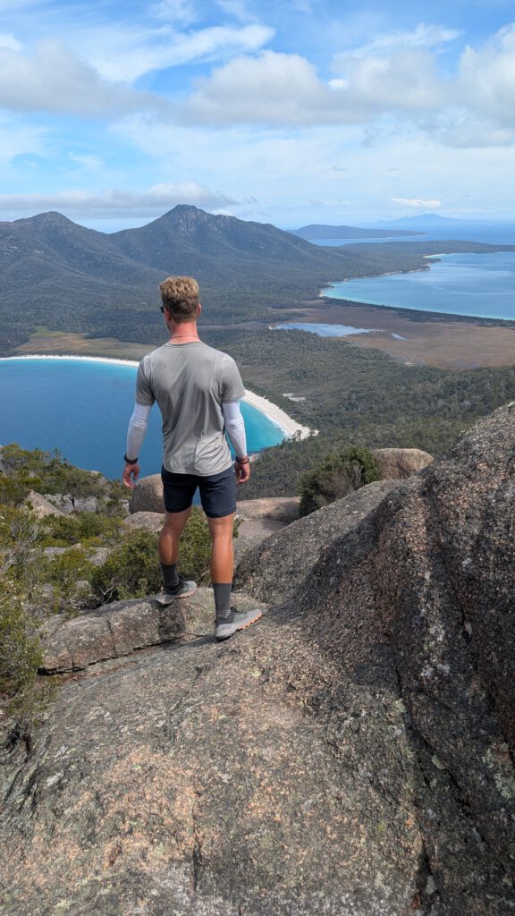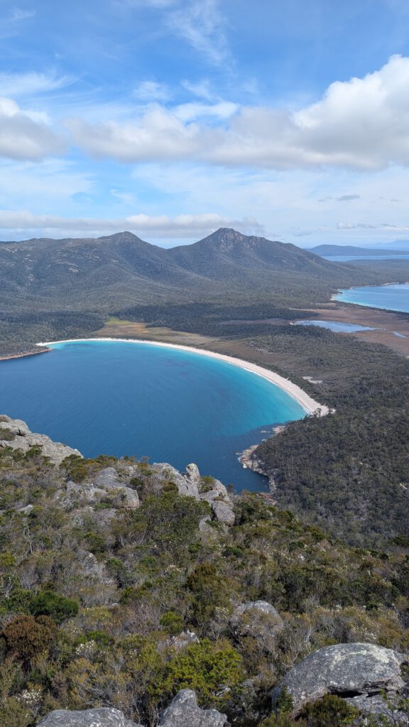 Aan de oostkust van Tasmanië ga ik naar Wineglass Bay. In vergelijking met Cradle Mountain is het een relatief korte hike. Onderaan de berg staat een bord waarop staat dat het gemiddeld drie uur duurt. Op het moment dat ik dat bord lees, loop ik naast een meisje. Ik heb één grote fles water mee en zie dat zij ook maar één fles bij zich heeft. We kijken elkaar aan, kijken naar ons water, schieten beide in de lach en zeggen: “Ah, dat moet genoeg zijn.”