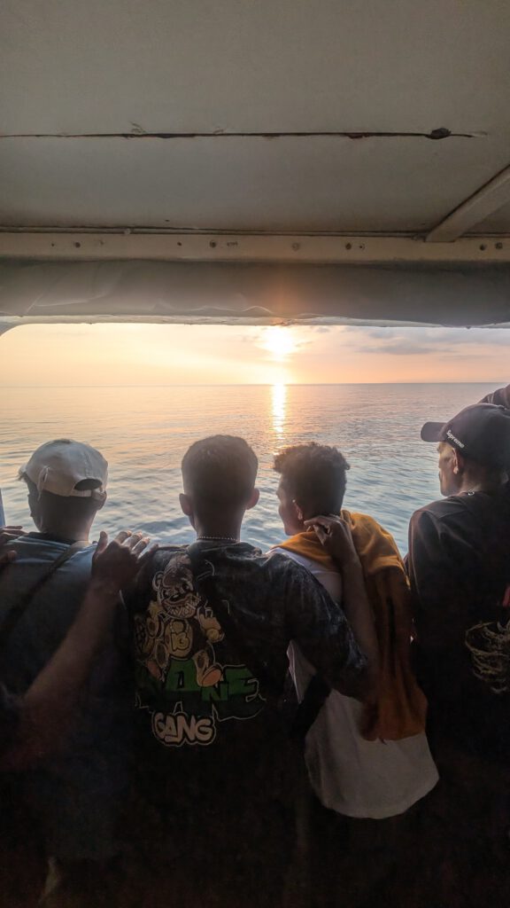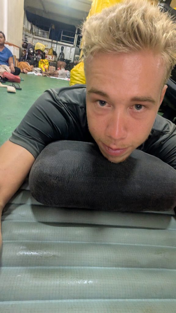 Vanaf het eiland Flores neem ik de ferry naar Timor, het laatste eiland van Indonesië wat ik ga bezoeken op deze reis. Dit keer is de ferry ’s avonds en ’s nachts dus het wordt slapen op de boot. Er zijn boven alleen maar stalen stoelen om op te zitten met harde armleuningen ertussen, waardoor je niet kan gaan liggen. In het ruim waar mijn fiets staat zitten en liggen ook allemaal families op kleedjes. Er worden dit keer geen dieren vervoerd dus het stinkt niet en ik besluit om erbij te gaan liggen. In het ruim blaas ik naast mijn fiets mijn matje op om te slapen. Ik slaap met mijn arm door de hengsels van mijn rugtas met waardevolle spullen erin zodat die niet gejat kunnen worden. Ik ben moe en val snel in slaap om een paar uurtjes later wakker te worden van een harde toeter dat we er bijna zijn. Ik ruim al mijn spullen op en heb kort maar eigenlijk best lekker geslapen. We komen om drie uur ’s nachts aan op Timor, wat een rotte tijd. Ik besluit om een rustig plekje op te zoeken om nog even verder te slapen. Na nog een paar uurtjes slaap word ik wakker langs het water met uitzicht over de haven. Rond mijn tent zitten tot mijn verbazing een aantal apen, die had ik hier helemaal niet verwacht. Gelukkig doen ze niks en kan ik rustig de dag beginnen.