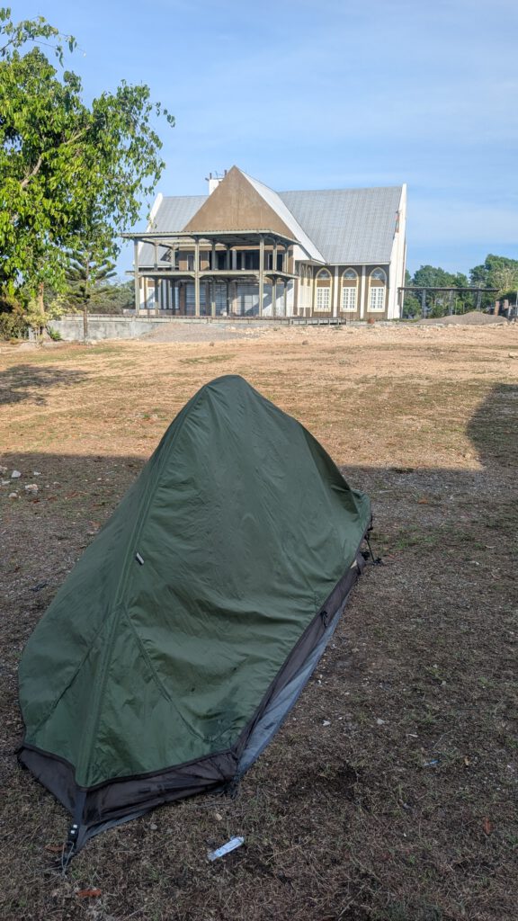 Op het eiland Timor is zowel aan de Indonesische kant als in Oost-Timor de meerderheid van de mensen Christelijk. Voor de eerste nacht lukt het niet echt om een geschikt restaurant te vinden om te vragen of ik er mag slapen. Op de kaart vind ik een kerk met groot grasveld en ik besluit om daarheen te gaan om het daar te vragen. Ik word door een jongen geholpen die vlakbij de kerk woont. Hij is 24 jaar en is Engels aan het leren, ik ben de eerste toerist die hij ooit heeft ontmoet en hij vindt het heel fijn dat hij nu in het echt zijn Engels kan oefenen. Hij helpt met het vragen bij de kerk voor het kamperen en het mag. Hij nodigt mij daarna zelfs uit voor het avondeten. Hij wil niet dat ik naar zijn huis kom, want hij schaamt zich een beetje voor de rommeligheid en omdat het een vrij armoedig huis is. Ik vertel hem dat het niet uitmaakt, maar hij staat erop dat hij met het eten naar het grasveld komt en dat we daar eten. Het is een onwijs vriendelijke jongen die hard aan het werk is om zijn jonge gezin te onderhouden. Het is een fijne avond en we kletsen uren over van alles in het leven.