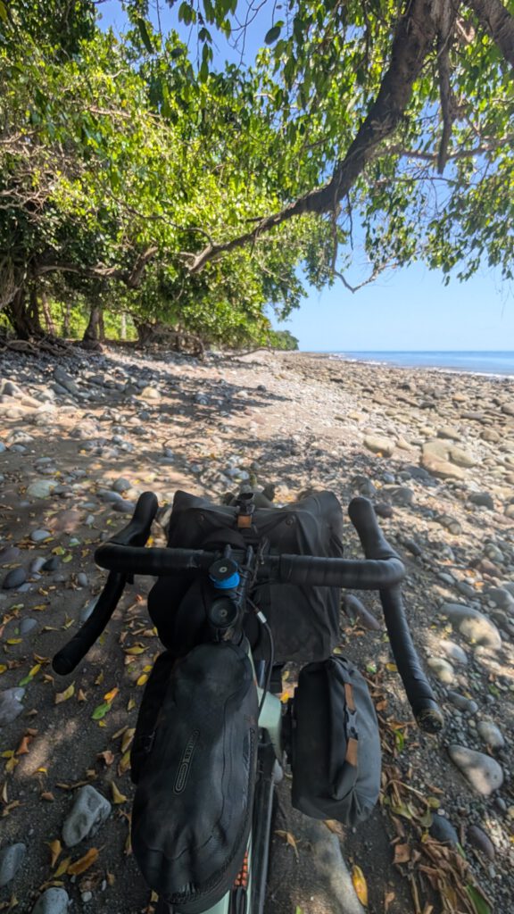 De weg naar de kust is goed, maar zodra ik de weg afsla langs de kust verdwijnt het asfalt en wordt het gravel. Het is goed te fietsen, maar hoe verder ik kom op de weg, hoe slechter de weg ook wordt. Gravel worden stenen en ik stuiter op de fiets alle kanten op. Een paar meter voor en na een brug ligt er wel asfalt, heerlijk. Soms fiets ik door een bocht en zie ik een stukje asfalt, zal het vanaf nu goed zijn, schiet er door mijn hoofd. Nee, shit, het is weer alleen een brug. Op een gegeven moment zie ik dat ik een stukje kan afsnijden als ik een onverhard pad neem. Het pad waar ik nu overheen fiets, voelt ook al als onverhard dus ik besluit om het te doen. Na een paar kilometer is het pad helemaal overgroeid en kan ik er niet meer overheen. Terug en omfietsen zou veel tijd kosten, dus ik besluit om een stukje over het strand te lopen. Het loopt zwaar over het strand, maar op zich kan ik er zelf wel om lachen, ik heb genoeg water mee dus in het ergste geval draai ik weer om als het niet mogelijk is. Het originele pad loopt door een rivier die veel te groot is om doorheen te lopen. Ik volg de rivier landinwaarts en vind daar weer een weg om op te fietsen.