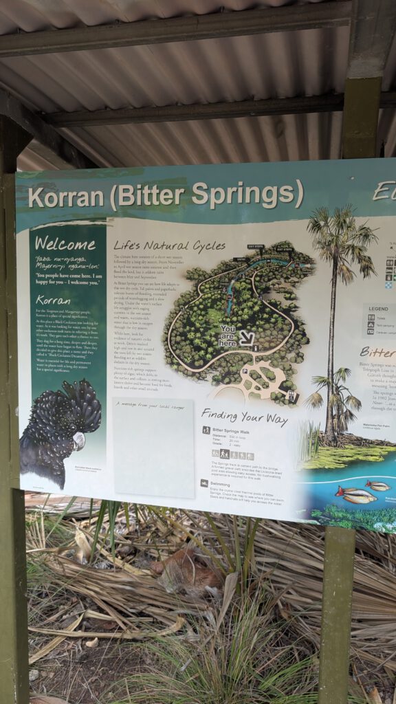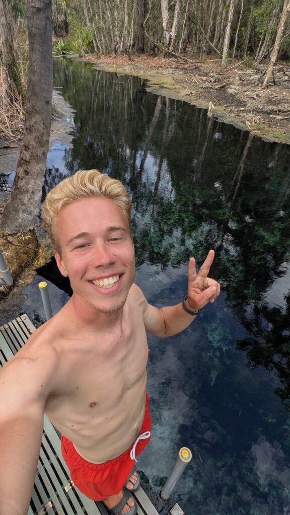 Na Katherine ga ik eerst naar Bitter Springs; dit is een natuurlijke waterbron waar je veilig kunt zwemmen zonder krokodillen. Het water is onwijs helder en wanneer ik er ben, is er helemaal niemand anders. Gek om op zo’n mooie plek helemaal alleen te zijn, maar dat maakt het nog bijzonderder. Voor onderweg heb ik nu meer zoute dingen mee om te eten, zodat mijn lichaam meer vocht vasthoudt. Ook neem ik vanaf nu elektrolyten, omdat dat beter is voor mijn lichaam. Ik fiets over de snelweg omdat er simpelweg geen andere weg is. Hier komen soms roadtrains voorbij; roadtrains zijn vrachtwagens met tot wel vier trailers. Echt megaindrukwekkend om te zien, heel machtig, maar het is ook oppassen omdat deze niet zo snel kunnen afremmen en fietsers nog wel eens over het hoofd gezien worden.