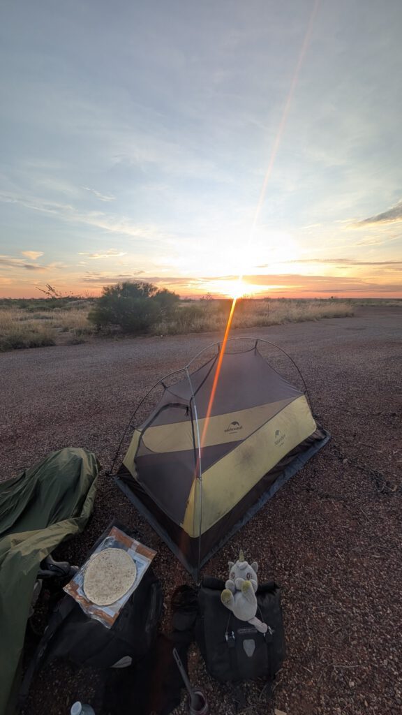 Tussen de dorpjes in is er ook echt helemaal, helemaal niets: geen boerderijen, geen huizen waar je nog kunt aankloppen, echt niets. De hele dag door fiets ik met hetzelfde uitzicht over dezelfde vlakke weg. In Australië ben ik weer aan het koken; dit had ik sinds Centraal-Azië al niet meer gedaan, maar ik vind het leuk om daar weer mee te beginnen. Pasta, noedels, maar vooral wraps; wraps vind ik zo onwijs lekker om te eten en het is ook nog eens makkelijk te maken. ’s Avonds kampeer ik vaak bij reststops; dit zijn parkeerplekken in de outback waar automobilisten kunnen uitrusten of mensen met een camper mogen slapen. Meestal is er helemaal niemand, wat het best bijzonder maakt. In het grote niets kamperen met de meest prachtige sterrenhemel die ik ooit heb gezien. Overdag is het 38 à 40 graden en ’s nachts koelt het iets af naar 28 graden. Omdat de zon de hele dag op de grond staat waar ik op kampeer, komt er ’s avonds en ’s nachts nog veel warmte van de grond mijn tent in. Het is ’s nachts hopen op een briesje dat door mijn tent waait, maar het gebeurt ook regelmatig dat ik stil lig in bed en flink lig te zweten. Ik merk na de eerste dagen dat mijn lichaam nu wel meer gewend is aan deze omstandigheden en het vele water drinken. Ik heb ook geen last meer van kramp, dus als ik op deze manier doorga, dan red ik het door de outback.