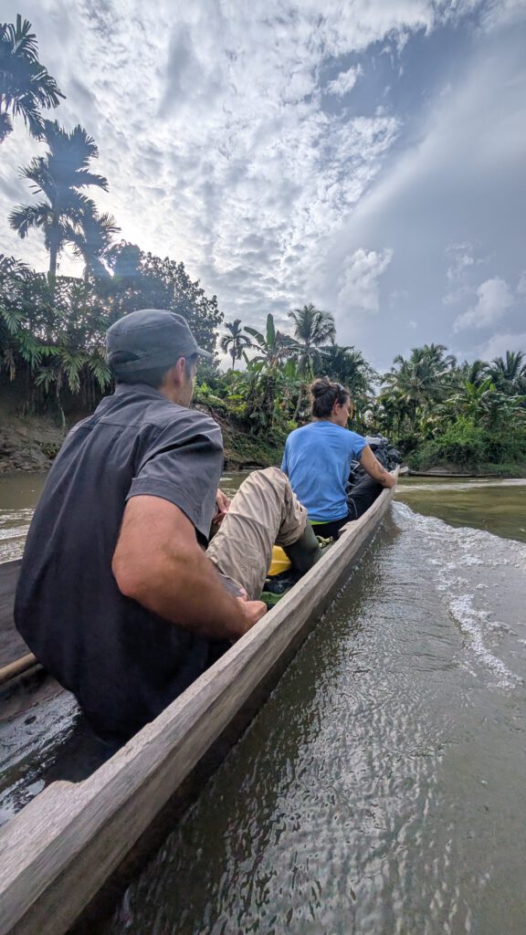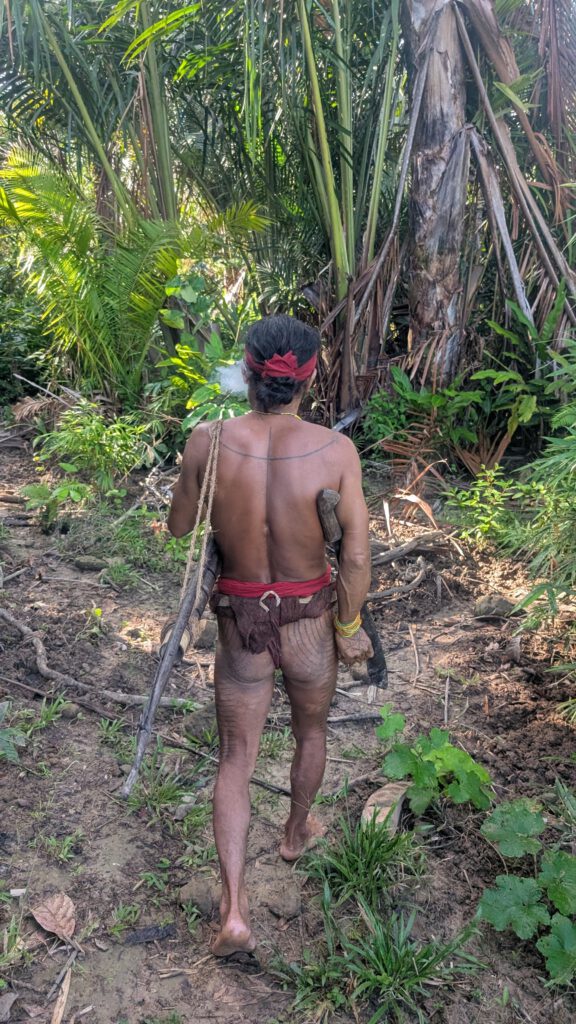 Alleen al bij de stam komen is een avontuur op zich en duurt bijna een volle dag. We vertrekken ’s ochtends met een groep van zeven toeristen en een gids/tolk vanuit Padang. ’s Ochtends vroeg gaan we eerst met de veerboot naar het noorden van Siberut eiland. Wij moeten echt in het zuiden zijn en na een korte lunch gaan we weer verder met de veerboot naar de andere kant van het eiland. Hier zijn we begin van de middag en hier beginnen we aan een jeep-tocht van twee uur. Het is absoluut niet geasfalteerd; we rijden over een modderig pad steeds verder het eiland in. We stoppen bij het laatste afgelegen dorpje om vanaf daar verder te gaan in een gemotoriseerde kano. Voordat we de kano ingaan, ontmoeten we hier de sjamaan van de familie waar we bij verblijven. De sjamaan is het hoofd van de familie en hij zal ons de komende dagen meenemen. Ongeveer een half uur gaan we met de kano over een klein riviertje nog verder de jungle in. Na de kanotocht moeten we nog een kwartier wandelen door dicht begroeide jungle. De sjamaan wijst ons de weg en loopt voorop. Hij ziet er indrukwekkend uit met tatoeages, loopt alleen met een doek om zijn geslachtsdeel en loopt rond met een pijl-en-boog. Ondanks dat hij er indrukwekkend uitziet, heeft hij wel een hele vriendelijke lach waardoor ik mij welkom en veilig voel. Na een kwartier wandelen komen we bij het communitiehuis, dit is waar de familie altijd samenkomt en waar de sjamaan ook woont met zijn gezin. Hier worden wij nu ontvangen door de hele familie. In de stam spreken ze een lokale taal, daarom is onze gids ook onze vertaler; hij spreekt goed Engels en ook goed de lokale taal. In Indonesië word ik eigenlijk overal met een lach ontvangen en dat is hier ook absoluut het geval. De kinderen zijn nog wat zenuwachtig en de volwassenen willen allemaal je naam weten. Ze vertellen mij ook allemaal hun naam, maar ik heb zoveel nieuwe indrukken dat ik er welgeteld nul onthoud. Het communitiehuis is een open houten huis. Binnen hangen er schedels aan de muur van dieren die ze hebben gevangen in de jungle. Voorin is een open zitruimte, in het midden een deel waar wij kunnen slapen en aan de achterkant een haardkeuken en het deel waar het gezin van de sjamaan slaapt.