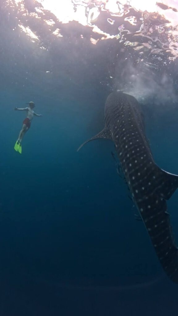 Walvishaaien zijn niet gevaarlijk voor mensen en vallen nooit mensen aan. Het is veilig om met walvishaaien te zwemmen, je moet ze natuurlijk niet aanraken. Wanneer je het water in gaat, zie je pas hoe bizar groot zo’n walvishaai is. Ik voel mij heel klein en machteloos in het water. Er was een moment dat de walvishaai recht op mij af kwam zwemmen en dat is toch wel een broekpoepmomentje, zo spannend. We hebben ruim de tijd bij de walvishaai dus niet alle toeristen liggen de hele tijd in het water. Je kan soms wel even ‘alleen’ zijn met de walvishaai en dat zijn toch wel hele magische momenten. Het is zo enorm indrukwekkend hoe groot zo’n dier is. Ik kan er uren naar kijken en blijf ook net zo lang in het water totdat de walvishaai wegzwemt. Wat een ervaring.