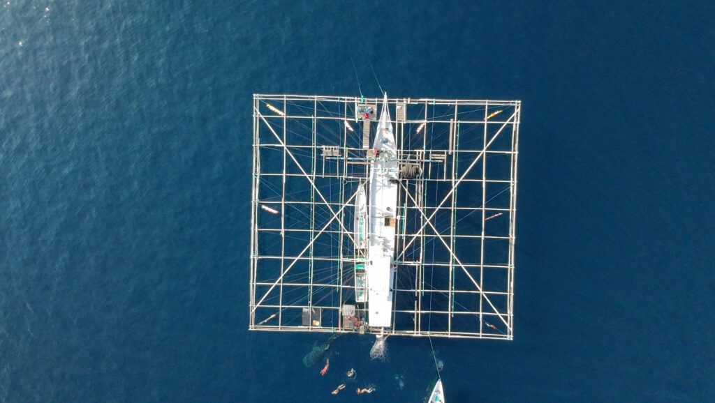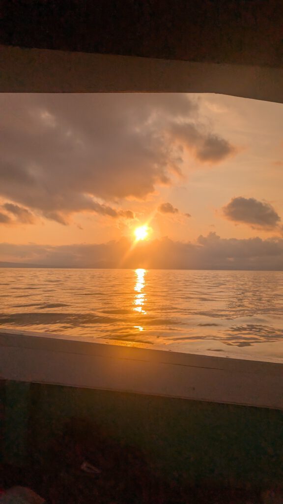 De eigenaar bij wie ik een tour doe heeft ook een restaurant. Bij dat restaurant heb ik ’s avonds gegeten en mag ik mijn tent opzetten om te slapen. ’s Avonds praten we wat over de walvishaaien, ik vertel dat ik wel met een dubbel gevoel zit. Hij bevestigt het verhaal wat ik op internet heb gelezen en dat stelt mij enigszins wel gerust. ’s Ochtends vroeg brengt hij mij naar de haven waar ik met een groep van zeven andere toeristen een boot op ga. Het is ongeveer anderhalf uur varen en op de boot is er ruimte dat iedereen nog een beetje verder kan slapen. Tijdens de boottocht komt de zon op en komen we steeds dichter bij de walvishaaien. Er zijn in het water grote boten die worden gebruikt als voerplatformen vanaf waar ze de walvishaaien eten geven. Het eten bestaat voornamelijk uit garnaaltjes. Wanneer we aankomen bij het voerplatform is daar al een walvishaai aanwezig. Machtig groot om meteen die bek te zien uit het water. Iedereen maakt zich klaar om het water in te gaan en dan mogen we erin.