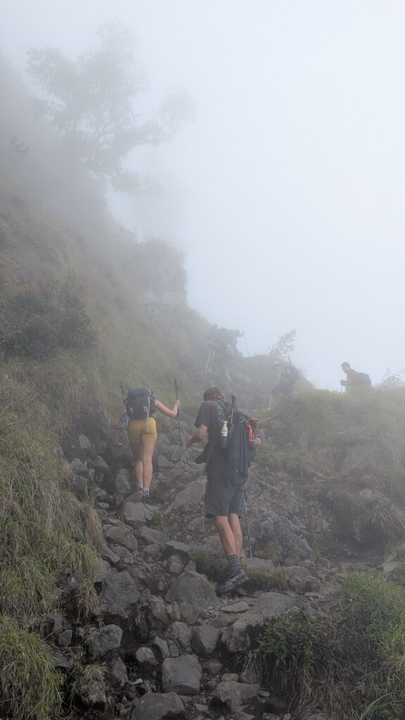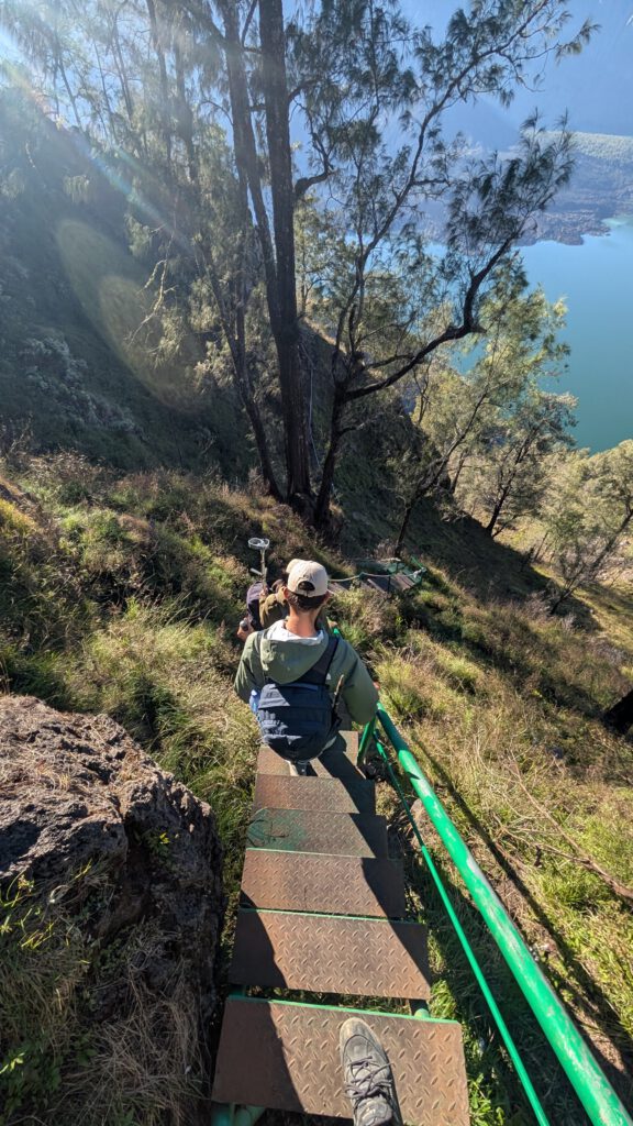 Met de groep zijn we de eerste dag goed doorgekomen. Na een nacht slapen op de kraterrand in tentjes gaan we verder met dag twee van de drie. We gaan de krater in naar het meer. We gaan zeshonderd meter naar beneden en daarna zullen we weer zeshonderd meter naar boven gaan naar een andere plek op de kraterrand. Omdat we vrij hoog slapen rond de 2600 meter koelt het ’s nachts behoorlijk af. De slaapzakken die we kregen waren gelukkig goed en ’s morgens met de zon erbij warmt het al snel lekker op. Na een ontbijt met pannenkoeken beginnen we met wandelen naar het kratermeer. De weg naar beneden is steil en vrij technisch. Ik vind dit een stuk lastiger dan naar boven lopen. Soms zoek je naar grip om niet weg te glijden. Bizar is dat een van onze gidsen al de hele tijd op teenslippers loopt. Dit loopt lekkerder, zegt hij, ik vind het vooral bizar dat hij niet uitglijdt. Een paar maanden voordat ik Rinjani wandel, is de berg ook een tijdje dicht geweest. Dicht omdat er een dodelijk ongeluk is gebeurd. Omdat je weet dat dit is gebeurd, loop je toch met een klein beetje spanning rond.
