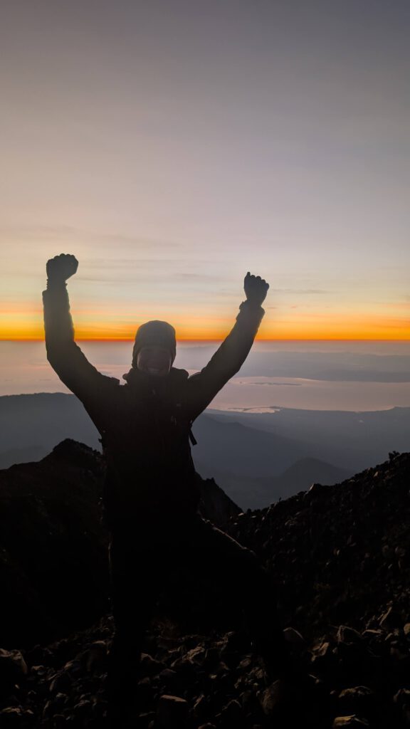De tocht naar de top is niet technisch, maar het is heel veel los grind waardoor je na iedere stap weer een stukje naar beneden glijdt. Dat maakt het zwaar en nu we boven de drieduizend meter komen, begin je ook wel goed te merken dat er minder zuurstof in de lucht is. Een aantal van onze groep hebben het behoorlijk zwaar, maar gelukkig weten we allemaal de top te bereiken voor de zonsopkomst. Het is een van de mooiste zonsopkomsten die ik ooit heb gezien, de natuur maakt er een mooie show van.