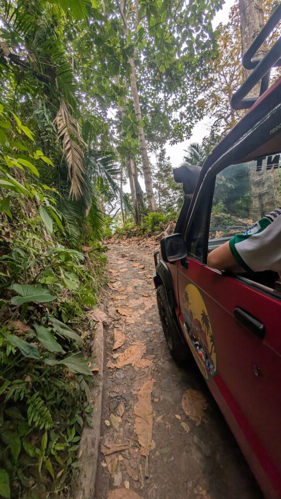 We gaan met een klein groepje van drie toeristen in een jeep naar het centrum. De tocht erheen is al een heel avontuur met een onwijs ruige weg. In de jeep worden we behoorlijk door elkaar geschud. Onderweg rijden we door de jungle en zien we verschillende apen en een neushoornvogel. Ook worden we getrakteerd op lokaal fruit dat langs de weg groeit. Wanneer de weg iets minder ruig is, mogen we ook op het dak van de jeep zitten. Minder ruig is trouwens behoorlijk relatief, want we hebben dan alsnog een aantal rivieren die we door moeten.