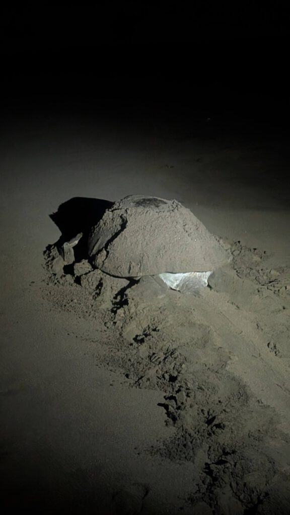 Wat het schildpaddencentrum doet is de eitjes van de schildpadden opvangen en deze gecontroleerd uit laten komen. De babychildpadjes worden vervolgens binnen twee dagen na het uitkomen vrijgelaten. Dit wordt gedaan omdat de schildpadden anders uitsterven. Wanneer de eieren begraven blijven liggen op het strand, worden ze vaak opgegraven door roofdieren. Omdat de eieren nu opgevangen worden, gaat het uitbroedingspercentage van 20% naar 90%. De schildpadden komen ’s avonds het strand op om eieren te leggen en de avond dat wij er zijn, gaan we ook het strand op om dit te aanschouwen. Niemand mag zijn zaklamp aan hebben of foto’s met flits maken omdat dit de moederschildpad stress oplevert. We vinden op het strand een schildpad die bezig is met eieren leggen en hier kunnen we voorzichtig gaan kijken. Er worden zo’n honderd eieren gelegd en deze eieren worden door de rangers meteen opgevangen. Na het eieren leggen maakt de moederschildpad het gat dicht en gaat ze terug de zee in. Heel bijzonder om mee te maken.