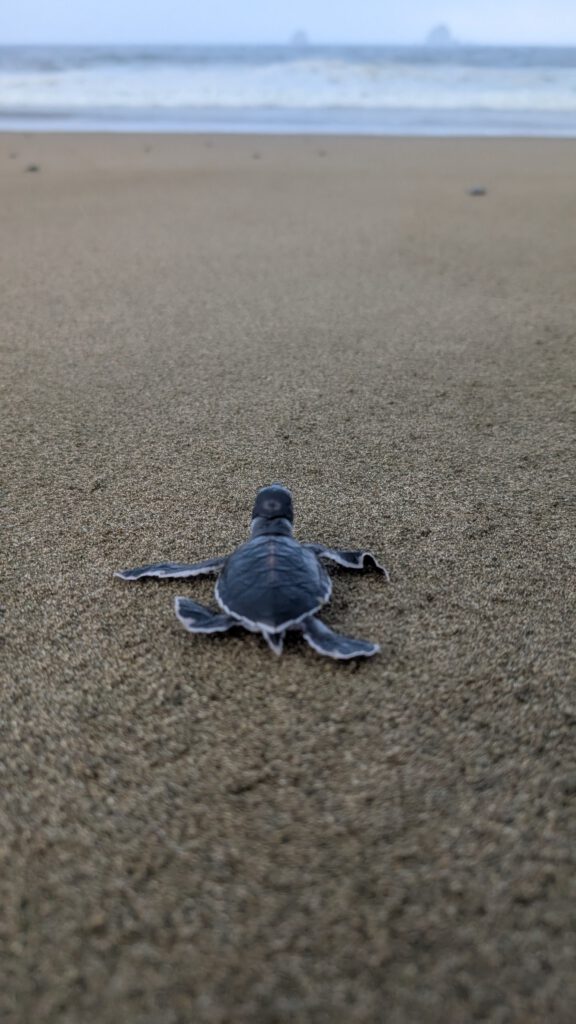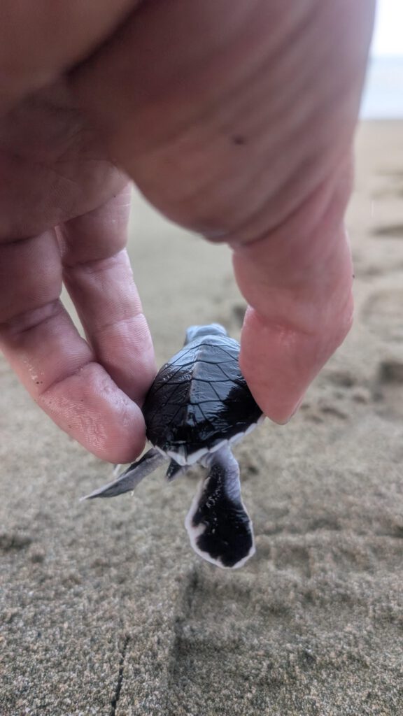 In het schildpaddencentrum worden de eitjes begraven in het zand, waardoor ze op een veilige manier uit kunnen komen. De schildpadjes worden na het uitkomen niet gevoerd om het zo natuurlijk mogelijk te houden. ’s Ochtends bij het eerste zonlicht gaan we een aantal pasgeboren schildpadjes vrijlaten. Hierbij is het belangrijk om de schildpadjes niet op hun buik aan te raken want daar zit de placenta (energie voor de eerste paar dagen) en wanneer we als mensen die aanraken, kunnen ze ziek worden. Het vrijlaten gebeurt op zo’n twintig meter van de waterlijn af. Schildpadden hebben een heel bijzonder stukje geheugen waarmee ze later naar hetzelfde strand terug komen om eieren te leggen als waar ze zelf geboren zijn. Die twintig meter hebben ze nodig om de omgeving op te slaan in dat speciale stukje geheugen. Super bijzonder dat mocht een van de vrouwtjes het redden om oud te worden en kinderen krijgen, ze terugkomt naar dit strand.