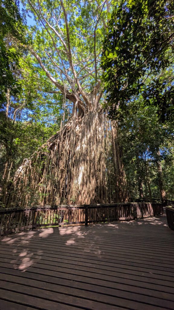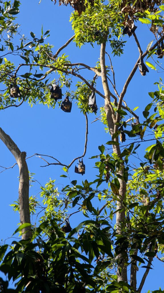 Vanaf de waterval fiets ik naar de Curtain Fig Tree, een hele bekende boom in Australië. Er is een soort boom die omhoog klimt via andere bomen. Daarbij laat de boom allemaal wortels naar beneden groeien die dan in de lucht hangen. Dit is hier ook gebeurd, maar dan bij twee bomen die tegen elkaar zijn gevallen. Hierdoor is een heel gordijn van wortels ontstaan in de lucht. De twee bomen die eerst het frame vormden, zijn inmiddels dood en weggerot, waardoor je alleen nog de “gordijnboom” over hebt, wat een prachtig gezicht is. Ook loop ik door een park waar je vogelbekdieren kunt zien, een iconisch dier voor Australië. Ik loop door het park en spreek meerdere mensen die al een vogelbekdier hebben gezien. Ik heb echter geen geluk bij het spotten ervan. Wel zie ik in het park een waterrat, een kangoeroe, een schildpad en heel veel vleermuizen in de bomen. Dus ondanks dat ik geen vogelbekdier heb gezien, zag ik wel een hoop andere dieren. Gelukkig zijn er in Australië nog meer plekken waar je vogelbekdieren kunt zien, dus ik hoop ze later nog ergens te spotten.