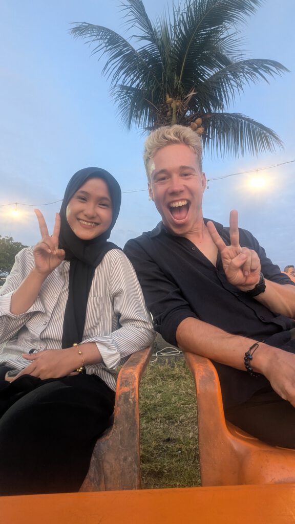 Ik heb contact met de dochter van het gezin. Omdat ze streng moslim zijn, mag ze niet in haar eentje met mij afspreken. Haar zus, die geen Engels spreekt, komt ook mee. We eten aan de boulevard bij een restaurantje. Het is leuk om met een local op stap te zijn die vanuit het geloof veel andere standaarden heeft ten opzichte van mij. Ze kan er goed over praten en is ook respectvol naar het feit dat ik niet gelovig ben. De twee dagen die ik in Padang ben, gaan we beide keren samen eten, en met haar zus erbij. Ze laten mij allemaal lokaal eten proeven dat ik nog niet eerder had geproefd. De laatste dag rijden ze met de scooter mee naar mijn hostel omdat het voor hen toch op de route lag. Ik vraag of ik ze een knuffel mag geven om ze te bedanken voor de leuke tijd en om gedag te zeggen. Vanwege het geloof mogen ze geen knuffel geven, dus we houden het bij een hand. Het dekte voor mij niet helemaal de lading voor een vriendschappelijk afscheid voor de band die we inmiddels opgebouwd hadden, maar tegelijkertijd respecteer ik hun geloof en snap ik dat ze niet in het openbaar een man een knuffel mogen geven.