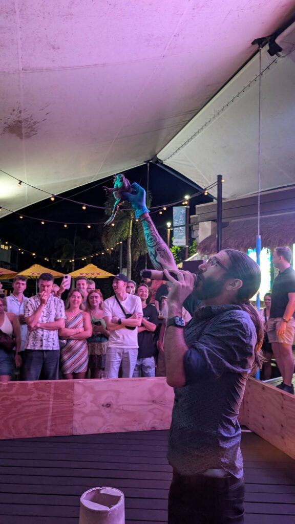 Eenmaal terug op het vasteland ga ik ’s avonds nog een drankje doen. Ik beland in een bar waar we met kikkers racen. Het concept is vrij bizar: er worden vier kikkers losgelaten in het midden van een houten vierkant van vijf bij vijf meter; de kikker die als eerste een muur raakt, wint. Voor de race worden de kikkers een voor een gepresenteerd en geveild. Degene die het hoogste geldbedrag biedt, heeft die kikker voor de race. Degene met de winnende kikker krijgt het geld van de andere drie. Het zijn “Cane Toads”, echt extreem dikke padden. Wanneer de kikkers zijn geveild en de emmer waar de kikkers onder zitten wordt opgetild, gaat het publiek helemaal los. De eerste tien seconden gebeurt er echt helemaal niks en blijven de kikkers gewoon op hun plek zitten. Langzaam komt er een op gang en wanneer diezelfde kikker de muur raakt, zit de rest nog in het midden. Ik vind het een originele vorm van entertainment, maar heb er ook mijn twijfels bij qua dierenwelzijn.